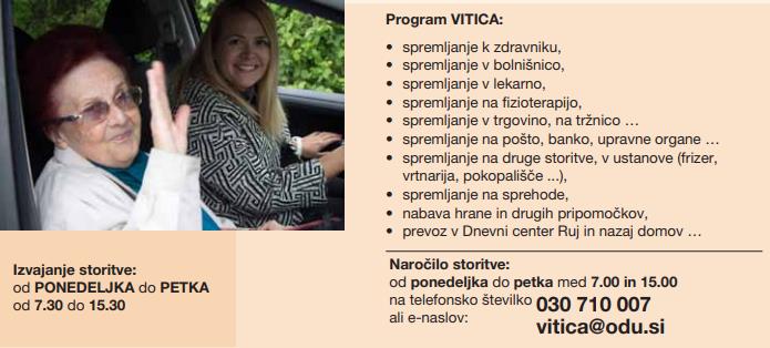 Program Vitica starostnikom nudi storitve spremstva in pomoč pri posameznih življenjskih opravilih, kot so: