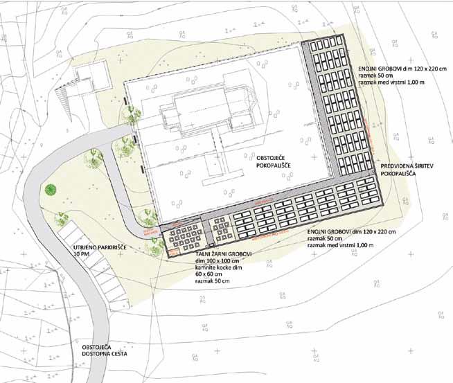 Predvidene so zunanja ureditev okolice, nova postavitev javne razsvetljave in izgradnja 10 parkirnih mest, poleg tega pa tudi podaljšanje obstoječega vodovodnega priključka za potrebe mrliške vežice. Širitev pokopališča je predvidena v smereh južno in vzhodno od obstoječega pokopališča (glej skico). Predvidenih je 150 novih grobov, od tega jih je 29 urejenih kot talni žarni grobovi ter 121 kot enojni grobovi. V JZ vogalu območja je umeščen tudi prostor za raztros pepela v velikosti 5 kvadratov. Razširitev pokopališča upošteva značilnosti obstoječega pokopališča in lokalne značilnosti prostora. Obstoječi kamniti zid se ohrani kot krajinska značilnost. Predviden je nov vhod na razširjeni del pokopališča, ki se nadaljuje z rampo in tlakovano dostopno potjo širine 1,8 m. V J delu novega pokopališča se nahaja tudi dostop do vode za zalivanje rož. Zaradi širitve obstoječega pokopališča je potrebna izgradnja novega podpornega zidu v dolžini 130 metrov.